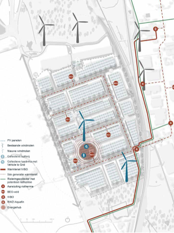 We hebben de huidige situatie op vlak van energie in kaart gebracht en toekomstbeelden vastgelegd voor 2030 en 2050. Zo zullen er twee windmolens geplaatst worden, wordt de PV-productie geoptimaliseerd en wordt er een parkeertoren geplaatst die als energiehub dienst doet, met uitgebreide laadinfrastructuur. Er worden handvaten aan de bedrijven aangereikt voor het verduurzamen van hun interne processen, energiedelen en het beter afstemmen van de energievraag met het aanbod, bv. door gebruik te maken van individuele of collectieve batterijen. Ook de ontwikkeling van een 5e generatie warmtenet, gekoppeld aan geothermische en aquathermische bronnen, wordt mee opgenomen in het plan.